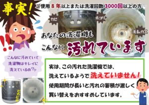 とくに8年以上または洗濯回数3,000回以上ご使用の洗濯機は、内部の汚れや部品の劣化が進みやすく、